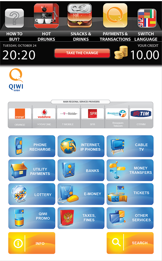 With RossoBar Touch you get three machines in one: hot drinks vending machine, providing an extensive range of perfect coffee, superior tea which all demand the finest ingredients; snack vending machine with two temperature zones, selling up to 64 SKU of snacks, confectionery or cold drinks; Transactional kiosk (terminal), enabling mobile phone top-up, internet, cable TV, tickets, online games or any other prepaid services.